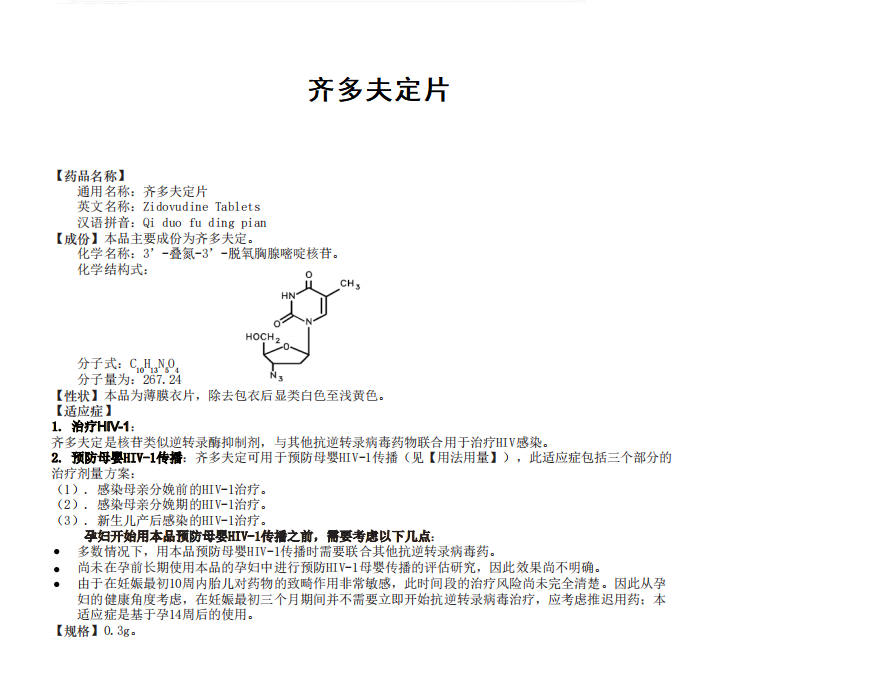 齊多夫定片(300mg)