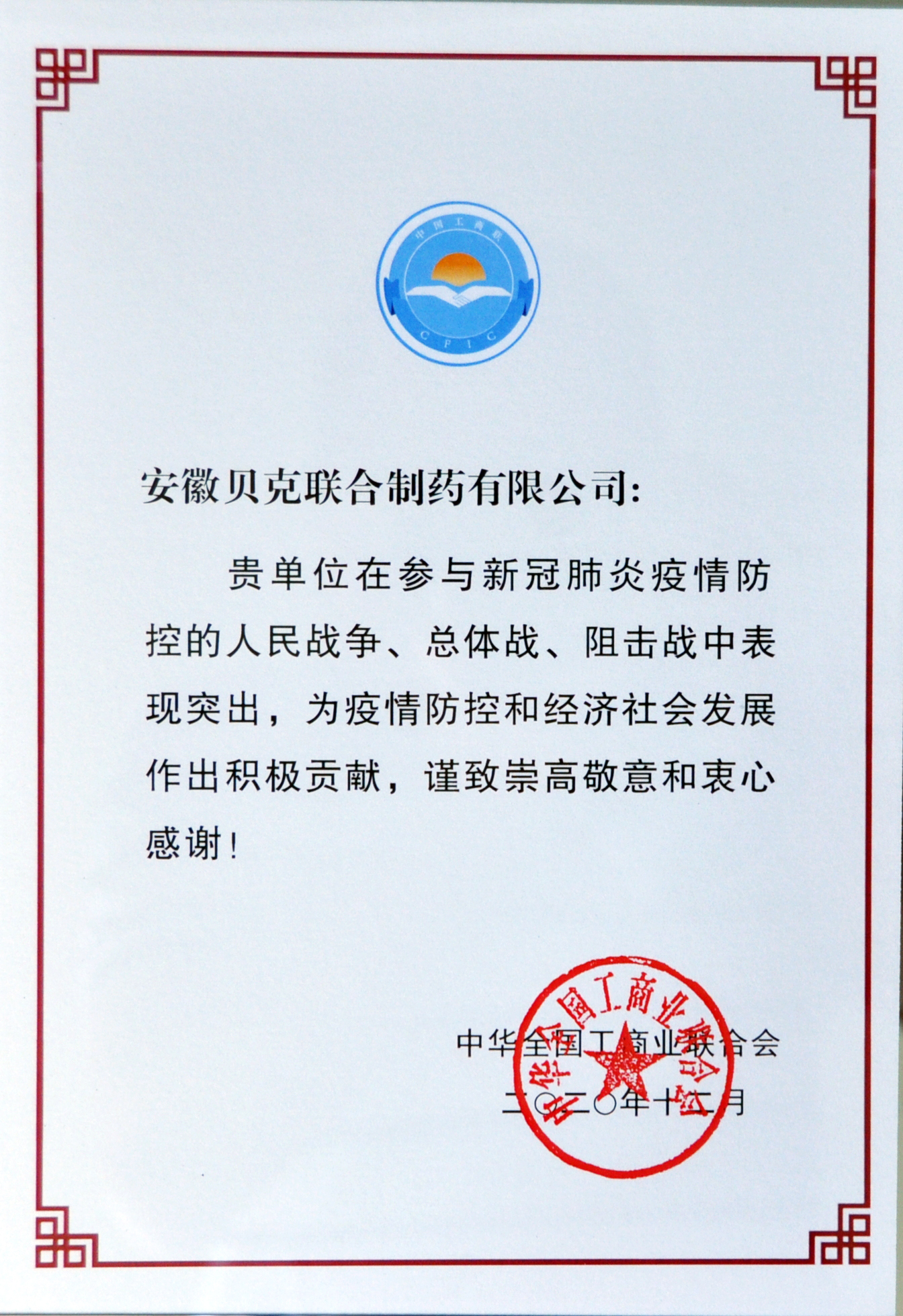 工商業(yè)聯(lián)合會(huì)感謝函